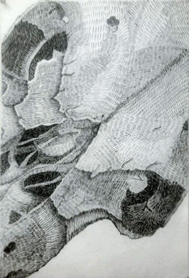This charcoal pencil drawing series is of a cow skull and explores the application of various texturing methods, including blended shading, stippling, and hatching.